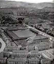 As a result of the club's promotion to the Premier Division in 1983, Muirton Park became a designated stadium under the Safety of Sports Grounds Act.[1] The club was immediately relegated to the lower divisions, but the designation remained in place and the club could not afford the remedial work required.[1] The North Stand, plus part of the Centre Stand, were closed off as a direct result of the disastrous fire at Bradford City in 1985 raising the issue that all such wooden stands were simply too dangerous. Of 2185 seats in the main stand, only 500 were permitted for use.[1] The future looked bleak for Muirton Park and for a club looking at huge costs to bring the ground up to modern standards if they achieved their aim of playing at the top flight of Scottish football. Muirton Park had remained almost unchanged until a permanent segregation fence was put in place prior to a Scottish Cup tie against Aberdeen in 1988.