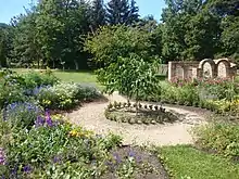 The Mulberry garden, originally Morušová zahrada in Czech, is a cottage garden in the Czech Republic, situated in the Czech Central Uplands in the village Režný Újezd, 7 kilometres (4.3 mi) northwest of the town Lovosice. The garden was established in 2014 by local gardeners admiring the English cottage garden style.[1] Apart from different kinds of plants such as perennial plants, English historical roses, Czech roses, annual plants, and bulbs, several uncommon fruit trees are grown, especially various mulberry varieties. Mulberry garden is located along the green tourist track to Boreč hill in the grounds of former Gentlemen's farm, house no. 2.