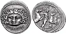 Denarius of Lucius Plautius Plancus, 47 BC. The obverse depicts a facing head of Medusa. The reverse is a reproduction of Nicomachus of Thebes' Victory in a Quadriga, which was placed in the Temple of Jupiter by Lucius Munatius Plancus, consul in 43 BC and Plautius' natural brother.[22][23]