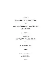 Muntakhab-ut-Tawarikh is a general history of the Muslims in India from Sabuktigin to 1595, commenced in 1590 followed by biographies of shaykhs, scholars, physicians and poets.[1] `Abd al-Qadir Bada'uni began writing this history in the first half of 1590.[2] The book was completed by October 1595. Its comprises on the 618 solar year's historic events. Muntakhab-ut-Tawarikh is based largely on Khawaja Nīzām-ud-Din Ahmad Sirhindi's Tabakāt-i-Akbar Shāhi (also known as Tabakāt-i-Akbari), with characteristic asides by `Abd al-Qadir Bada'uni.