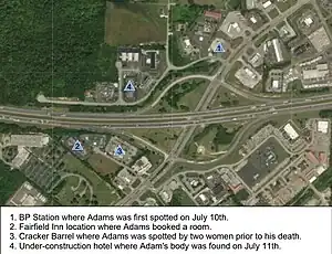 Adams arrived in East Knox County, Tennessee, between Knoxville and Strawberry Plains sometime on the evening of July 10,[2] approximately 500 miles (800 km) southwest of Washington, D.C.[4] The first reported sighting of Adams in Knoxville occurred at a BP gas station at Strawberry Plains Pike at 5:30 pm.[2][3] Gerald Sapp, an Interstate Repair Service driver, had been called to the gas station; Adams had told the clerk there that he was having difficulty with his car key and was unable to enter the vehicle.[3] When Sapp arrived, he realized that the key Adams had attempted to use was for that of a Nissan (the vehicle he had abandoned in Seattle) not the Toyota he was driving.[3] Sapp recalled: "I asked him to look in his pockets. I said, ‘If you drove this thing up here, you gotta have another key in your pockets.’ And he wouldn’t look. So I thought he was nuts. He was bound and determined that he had the key he needed for that car."[3] Sapp arranged to have the car towed to a local repair shop, and dropped Adams off at a Fairfield Inn in Knoxville on Cracker Barrel Lane.[3]