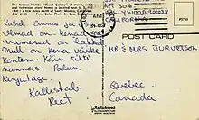 Postcard sent by Jurvetson to her parents in Canada, prior to her death, serving as their final form of communication.