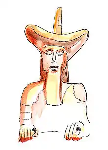 The major piece of the group is a seated terracotta statue with a wide brimmed hat, reminiscent of a cowboy hat, known as the Murlo Cowboy.[13] The statue is approximately 1.5 meters tall.[14] The bold facial expressions are representative of Archaic Greek Sculpture, as they eyes and lips appear to be protruding from the face. It is believed that the distinct facial features allow visitors to see them from afar, allowing for the statue to carry out its protective duties.[15] The statue probably represents a haruspex.