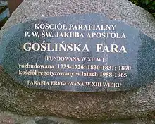 Murowana Goślina was a privately owned village, and changed owners often. From 1593 it was owned by Jan Rozdrażewski, who granted privileges and a coat of arms – a blue shield with three rosettes on a silver diagonal stripe (an angel was added in the 18th century). In 1605 the old wooden church was replaced with a brick church with a single nave, built onto the two-storey rectangular tower. In 1651 the village was acquired by Jan Leszczyński, and his family held it until 1694. In 1724-1726 the priest, Filip Woliński, added a presbytery to the church in place of the earlier apse. The tower was by this time raised above the level of the church and contained bells. The village was struck by plague on many occasions, and was also devastated during the Swedish Wars.