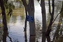 Murrumbidgee River in major flood in December 2010 and flood marker showing the height of the 1974 floods in Wagga Wagga