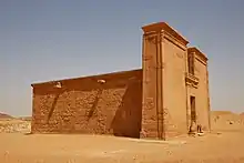 The Lion Temple is a single-chambered rectangular 14.21 m in length, 9.13 m in width and 4.7 m in height temple with pylon and six columns made of drums. Erected by King Arnekhamani and dedicated to Apedemak the temple bears inscriptions in Egyptian hieroglyphs and representations of elephants and lions on the rear inside wall as well as reliefs of Apedemak depicted as a three-headed god on the outside walls.[4] A 3D model of the Lion Temple can be seen here. An Animation of the Lion Temple 3D model can be view here.