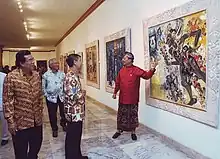 On the first and second floor, works of modern Indonesian artists are displayed, including works by Affandi, Basuki Abdullah, Srihadi Soedarsono (best known for his series of Borobudur paintings), Nyoman Gunarsa, and Made Wianta.[3] The works of post-modern Indonesian artists such as Nyoman Erawan and Made Budhiana are also presented. Museum Rudana also has paintings depicting temples in Indonesia such as Besakih in Bali, and Prambanan in Central Java.