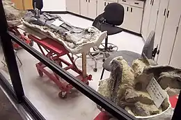 Apart from housing one of the largest collections of dinosaur fossils in the world and the largest in the United States,[14] the museum is also home to one of the world's largest Tyrannosaurus skulls (MOR 008) narrowly surpassing that of the Chicago Field Museum's specimen, Sue.[15] The museum's Siebel Dinosaur Complex is home to one of the first identified female dinosaurs, an ovulating T. rex.[1] Curator Horner, who served as an adviser to the Jurassic Park films,[14][16] was one of the lead scientists involved in the 2005 discovery of soft tissue remains in the thigh bone of a Tyrannosaurus,[17] which were later brought to the museum. The museum has also been involved in a number of other finds, including a baby Triceratops in Jordan, Montana, in 2006,[18] and "Yoshi's Trike" (MOR 3027), a large Triceratops specimen with 125 cm long horns, discovered in 2010.[19]
