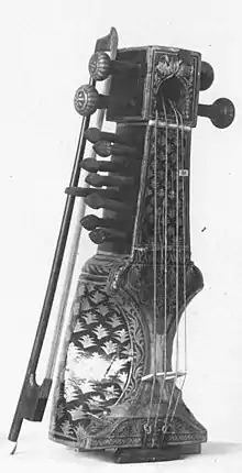 | Sarangi | Stringed instrument similar to a cello. There are 4 strings attached that can be adjusted with knobs. Played with a bow by holding the instrument in the left hand and using the bow with the right hand, and while standing.[14] | ![]() Sarangi, instrument used in Indian, Nepali, Pakistani, and Bangladeshi music |