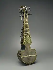 | Sitar | Stringed instrument similar to Tambūra. Made of a goard attached to a fingerboard. The fingerboard has 9-16 frets, 7 main strings, and 11-12 strings that are parallel to the main strings under the frets.[13] | ![]() Sitar, Indian instrument |