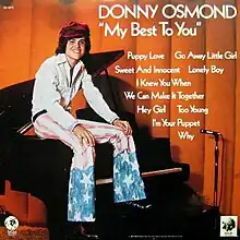 My Best to You is a compilation album by American singer Donny Osmond. It contains his hit songs from his first four albums: The Donny Osmond Album, To You with Love, Donny, Portrait of Donny, and Too Young. The album reached number 29 on the Billboard Top LPs chart on February 3, 1973. It was certified Gold by the RIAA on September 14, 1973.[1]