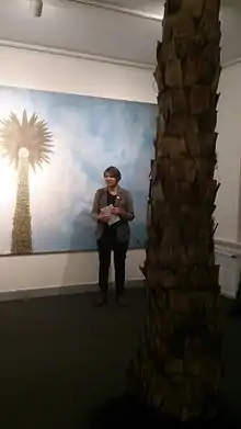 • Documentation of Greetings from Jerusalem Avenue (2002) by Joanna Rajkowska introduces one of the most striking monuments of Warsaw, the capital of Poland: an artificial palm tree, that artist conceived while visiting Jerusalem. This work reminds the cultural diversity of pre-war Poland. It is set up on the Jerusalem Avenue in Warsaw.[3] ˮTo me the highlight of the documentation of Rajkowska's work presented on the exhibition is not actually connected with the author but with the human rights activist campaign where a traditional Palestinian headscarf was tied around the palm tree,ˮ says Indrek Grigor.[11]