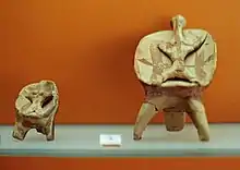 In the first room of Delphi Archaeological Museum is exhibited a clay figurine of the Mycenaean period, depicting a figure seated on what seems to be a tripodic chair. It was discovered in the region of the sanctuary of Athena Pronaia.[1] It is a particularly rare object, as the majority of Mycenaean figurines belong to the types Φ (phi) and Ψ (psi).