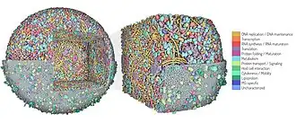 28. Karr, JR; Sanghvi, JC; Macklin, DN; Gutschow, MV; Jacobs, JM; Bolival B, Jr; Assad-Garcia, N; Glass, JI; Covert, MW (20 July 2012). "A whole-cell computational model predicts phenotype from genotype". Cell. 150 (2): 389–401. doi:10.1016/j.cell.2012.05.044. PMC 3413483. PMID 22817898.