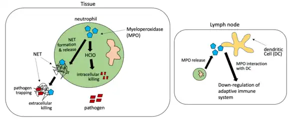 3. 1 2 3 4 5 6 7 8 9 10 Aratani Y (February 2018). "Myeloperoxidase: Its role for host defense, inflammation, and neutrophil function". Archives of Biochemistry and Biophysics. 640: 47–52. doi:10.1016/j.abb.2018.01.004. PMID 29336940.