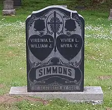 Myra Virginia Simmons was originally from Berkeley, California. According to the 1900 federal census, Simmons and her mother were born in California and her father was born in Jamaica.[8] In order to fund her education, Simmons worked as a domestic and sold newspapers.[9] In the 1930 census she was recorded as living with her aunt in San Francisco.[10] After a long career in civic engagement, Simmons died in 1965 and was buried in Cypress Lawn cemetery in San Bruno, California. A 2019 project by the National Women's History Alliance included her as part of their work to recognize the grave sites of California suffragists which was documented by the historian at Cypress Lawn.[11]