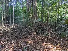 The tree grows upto 20 m tall. It is seen to have stilt roots that support the main trunk of the tree. These roots emerge from the base of the main trunk and bend downwards to reach the ground. The stilt roots form a tangled network of roots around the tree. The leaves are simple, alternate that grow on short stalks or petioles that are 2 - 4 cm long. Flowers are dioecious, with male flowers growing on stocks, while female flowers are borne in leaf axils. Male flowers typically grow in clusters and female flowers grow in twos or threes.[2]