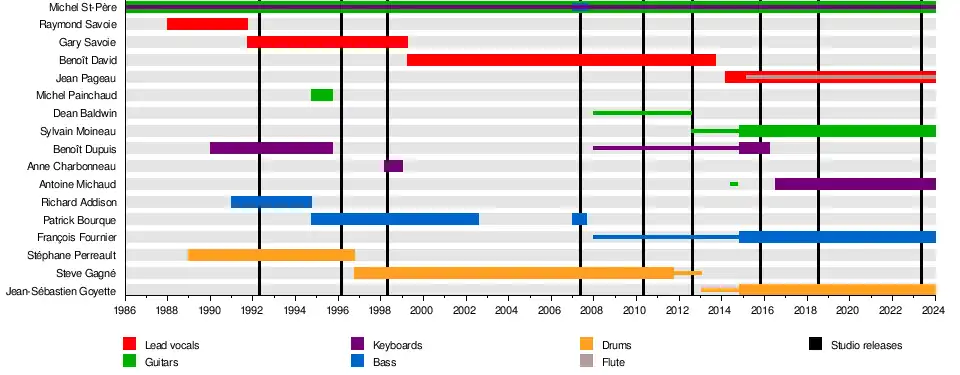 Mystery's current line-up is Michel St-Père, bassist François Fournier, guitarist Sylvain Moineau, drummer Jean-Sébastien Goyette, singer Jean Pageau and keyboardist Antoine Michaud.[1]