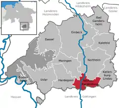 Neighbor communities are Bovenden (south), Hardegsen (west), Moringen (northwest), Katlenburg-Lindau (east) and Northeim (north)