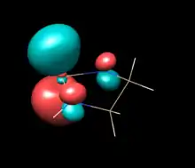 Computational studies and photoelectron spectroscopy create a more nuanced picture of electronic structure and π-electron sharing in NHSis. Relevant π bonding orbitals in unsaturated five-membered NHSis can be understood as the molecular orbital mixing of the diimine backbone's butadiene-like pi orbitals and the 3s and 3p orbitals of Si. Photoelectron Spectra of the unsaturated [tBuN−CH=CH−tBuN]Si: show a HOMO with three peaks at -6.96eV, -7.13eV & -7.28eV, assigned the in-phase overlap of the Si 3py orbital and buta-1,3-diene-like π3 of the diimine. The HOMO in the tetravalent Si-hydrogenated analog lacks a vacant Si 3py orbital and the energy of the π3 is destabilized to -6.56 eV, supporting charge donation from N to Si in the silylene. The HOMO-1 is the in-plane Si lone pair involved in σ donation. No difference is calculated between the HOMO-2 for the unsaturated silylene compared to the corresponding orbital of the silane analog. The original 1994 Denk at al. photoelectron spectroscopy communication relates this orbital to the π2 diimine orbital, however a 1996 paper from Blakeman et al. designates this as the nitrogen lone pairs. Either way, both orbital assignments are symmetrically forbidden from overlapping with any Si orbital. The HOMO-2 does not change in energy upon hydrogenation at Si indicating that much of the overall electronics are unchanged by hydrogenation and underscoring the effects of N to Si electron π-donation in the HOMO and HOMO-3. Calculations in the former study at the MP4 6-31G* level showed increased energy level spacing for N-H model compounds (instead of N-tBu), but with the same order and proportional spacing.[5][9] The Blakeman study compared the benzo-fused NHSi to the ethylene-like unsaturated NHSi, and found by PES that the HOMO is lower by .36eV and the Si lone pair by .34 eV in the benzo-fused NHSi, suggesting the electron withdrawing power of the phenylene ring makes the benzo-fused NHSi less nucleophilic.[9]