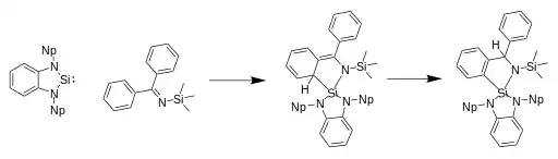 Imines do not form simple cyclic silylene additions: benzo-fused NHSis react with the diimine and ortho carbons of N-tert-butyl phenylimine to form a five-membered ring composed of the NHSi silicon, one carbon and nitrogen of the imine and the ipso and para carbons of the phenyl group, through an intermediate that breaks the phenyl aromaticity.[15]