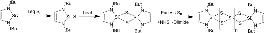 Reacting NHSis with oxygen strips the diimine backbone, and produces solid silicon dioxide, likely through a two NHSi dioxo-bridged intermediate. Reactions with 1 equivalent of S8 yields a dithio-bridged two NHSi complex. The formation of the dithio dimer occurs through an intermediate attributed to a thiosilylone, with a Si-S double bond. Excess sulfur yields a repeating NHSi(S2)(SiS2)nNHSi oligomer with complimentary diimine loss. The analogous reaction with selenium is far slower, but yields the diselenium bridged di-NHSi exclusively.[13]