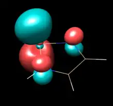 Natural Bond Orbital analysis of [HN-CH=CH-NH]Si: provides strong theoretical evidence of π electron delocalization. NBO calculations indicate a population of 0.54 electrons in the formally vacant Si 3py orbital (1.2 electrons would be expected in a pure 6 π-electron 5 atom ring). The saturated silylene has lower electron delocalization over the heteroallylic N-Si-N system with only 0.33 electrons on Si (versus 1.33 for perfect 4 electron shared among 3 atoms). No difference in charge sharing is seen in the σ-bond interaction between Si and N of each NHSi, this is also the case with NHCs. In spite of identical Si-N σ bonding, the unsaturated silylene has a lower charge separation in its Si-N bond than the saturated analog: for the unsaturated analog, Si has a charge of +0.87 and each N -1.00, while the saturated has a charge of +1.05 on Si and -1.12 on N. These data show that the stabilization and bond difference between the backbone types is entirely due to π interactions. For comparison, in an analogous way, germylenes have a charge near +1 at the germanium while cabenes have close to no net charge on the carbenic carbon. Calculations show, upon coordination to Group 11 metal chlorides (e.g. NHSi-CuCl) Si 3py density, N-Si bond density, and Si atom charge all increase. The change is the result of Si's sigma donation to the metal, which causes the Si 3p orbital to draw electron density from the ring. In this manuscript they calculate CuCl and AgCl back-donation to Si to be about 4.5 weaker than the σ interaction. Interestingly, for all three Group 11 metals, the NHSi in question is a better σ donor and π acceptor than its germylene and carbene analogs.[10][8]