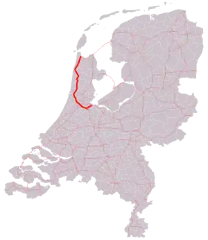The part between A1 and A2 is four lanes; between A2 and Rottepolderplein it is six lanes. Hereafter the way is mainly four lanes, with short pieces in the area of the Wijkertunnel that are six lanes.