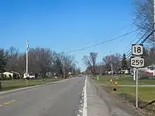 To the north of NY 104, NY 259 is known as Hilton–Parma Corners Road as it heads through a rural portion of the town. It intersects NY 18 south of the village of Hilton in the hamlet of Parma Center, then overlaps NY 18 northward for two miles (3 km) to Hilton, where it becomes South Avenue upon entering the village, then turning left on Main Street. The two routes split in the village center, with NY 18 continuing on West Avenue and NY 259 turning on Lake Avenue. NY 259 undergoes a name change at the Hilton village line, changing from Lake Avenue within the village to North Avenue outside of Hilton as it continues toward Lake Ontario. The route heads north, then northeast through a hilly, rural portion of northwestern Monroe County to a junction with the Lake Ontario State Parkway just south of the shoreline. NY 259 ends here; however, North Avenue continues north for 50 yards (46 m) to a dead end at the lakeshore.[3]