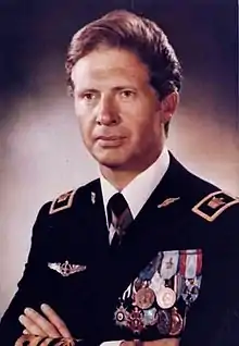 Sepahbod Nader Jahanbani (Persian: نادر جهانبانی, romanized: Nāder-e Jahānbānī; 16 April 1928–13 March 1979) was an Iranian general, distinguished fighter pilot of Imperial Iranian Air Force (IIAF) and the deputy chief of the IIAF under Mohammad Reza Shah Pahlavi, the last Shah of Iran. Despite being executed in 1979 by Islamic Revolutionaries, he is widely lauded as the "father of the Iranian Air Force" along with General Mohammad Khatami and General Amir Hossein Rabii , for modernizing the air force to become a potent and powerful force whose advanced equipment and training they acquired for Iran, such as the F-14 Tomcat, would save Iran's crucial infrastructure during the Iran–Iraq War. He was the leader of the Golden Crown, the first and national aerobatics display Iranian team. He is nicknamed the "blue eyed general of Iran". By many accounts, he is considered one of the best and most capable pilots of his time.