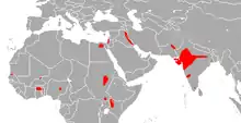 This bat is widely distributed across northern Africa and western Asia. Its range extends from Morocco and sub-Saharan Africa through Egypt and the Middle East to Pakistan and India. It is found in semi-arid and arid areas as well as tropical forests; wherever there is a combination of open areas in which to hunt and suitable roosting sites in rocky or underground locations. It is often associated with human settlements, but is not tolerant of much disturbance at its roosting sites.[1]