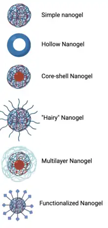 The structure of a nanogel is dependent upon the synthesis mechanism and its application. Simple or traditional nanogels are nanoparticle-sized crosslinked polymer networks that swell in water.[3][10] Hollow nanogels consisting only of an outer shell can increase the amount of cargo loaded into the platform.[3][10] In other nanogel structures, the inner core and outer shell can be made of two different materials, such as a hydrophobic inner core to surround drugs or other small molecules and a hydrophilic outer shell that interacts with the external environment.[2][3] The addition of a second linear monomer crosslinked to a nanogel is deemed a “hairy nanogel”.[2][7] Different nanogel synthesis methods can be completed in sequential order to create multilayered nanogels, such as starting with ionotropic gelation and then combining anionic and cationic polymers in an aqueous solution.[7][10] Functionalized nanogels, in which targeting ligands or stimuli-sensitive functional groups are conjugated to the outer shell of a nanogel, are also important for certain nanogel applications.[2][3][7][10]