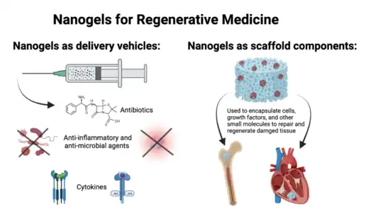 - 1 2 3 4 Grimaudo, Maria Aurora; Concheiro, Angel; Alvarez-Lorenzo, Carmen (November 2019). "Nanogels for regenerative medicine". Journal of Controlled Release. 313: 148–160. doi:10.1016/j.jconrel.2019.09.015. PMID 31629040. S2CID 204799512.