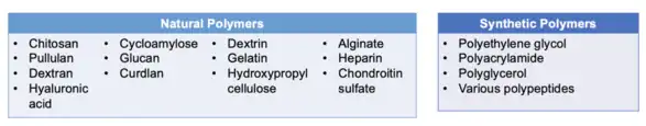 Since biodegradability is an important characteristic of nanogels, these hydrogels are typically composed of natural or degradable synthetic polymers.[3] Polysaccharides and proteins largely dominate the natural forms of polymers used to synthesize nanogels.[2][3] Due to the use of thiolated polysaccharides (thiomers) such as thiolated chitosan or thiolated hyaluronic acid[8][9] nanogels can be stabilized via intra- and intercain disulfide bonding. Advantages of natural polymer-based nanogels include biocompatibility and degradability by cellular mechanisms in vivo.[3] Natural polymers also tend to be nontoxic and bioactive in which they are more likely to induce biological cues that govern various aspects of cellular behavior.[3] However, natural-based polymers can still cause an immune response and possess other disadvantages such as variable degradation rates and heterogeneous structures.[3] Conversely, synthetic-based polymers have more defined structures, increased stability, and controlled degradation rates.[3] In comparison to natural-based polymers, synthetic polymers lack biological cues that may be necessary for specific therapeutic applications.[3] Given that natural and synthetic polymers are defined by their own set of advantages and disadvantages, an ongoing area of research aims to create composite hydrogels for nanogel synthesis that combines synthetic and natural polymers to leverage the benefits of both in one nanogel formulation.[3]