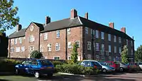 The former workhouse is a large three-storey building in red brick under a tiled roof. It has a U-shaped plan, with a long symmetrical front face and two long end wings which run away from the street.[1][5][13] The front face has a slightly projecting central bay, topped by a pediment bearing a clock face.[1][13] The main entrance is to the central bay; it has a semicircular head with a fanlight, and is flanked by a pair of small windows. The front face has seven casement windows to the ground floor.[1] In around 1971, the central bay had two Venetian windows with a semicircular head; only the second-storey one remains.[13][14] A bell tower and glazed porch to the main entrance have also been removed.[1][14] Little of the original workhouse interior remains.[1]