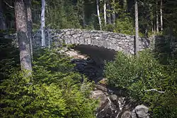 The Narada Falls Bridge is a reinforced concrete arch bridge in Mount Rainier National Park, spanning the Paradise River above Narada Falls. The bridge was built in 1927–1928 by contractor J. D. Tobin of Portland, Oregon, who built the Christine Falls Bridge at the same time. The arch spans 36 feet (11 m). The bridge is 20 feet (6.1 m) wide, with an additional 3.5 feet (1.1 m) on either side for sidewalks. It was faced with rubble stone masonry and is an example of National Park Service Rustic design. The bridge is not open for public traffic, and leads to the Narada park utility area.[2]