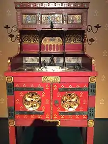 The Narcissus washstand is a piece of painted furniture made by the Victorian architect and designer William Burges in 1867. It was originally made for Burges's set of rooms at Buckingham Street and subsequently moved to his bedroom at The Tower House, the house he designed for himself in Holland Park in London. John Betjeman, later Poet Laureate and a leading champion of the art and architecture of the Victorian Gothic Revival, was left the remaining lease on the Tower House, including some of the furniture, by E. R. B. Graham in 1961. He gave the washstand, which he found in a second-hand shop in Lincoln, to the novelist Evelyn Waugh who featured it in his 1957 novel, The Ordeal of Gilbert Pinfold, mirroring a real-life incident when Waugh, in the grip of bromide poisoning, became convinced that an ornamental tap was missing from the washstand.[1][2][lower-alpha 1]