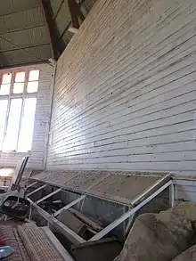 The internal walls are of vertical weatherboards to approximately one metre and then horizontal boards to the wall plate, which is about 4.8 metres (16 ft) above the floor. A series of primary and secondary curved laminated timber ribs support the roof and ceiling, which again is composed of horizontal purlins and vertical tongue and grooved boards. The primary ribs meet at a decayed octagonal timber ring beam, which supported the former vent. There is a spoke of steel cross-ties at top plate level.[1]