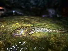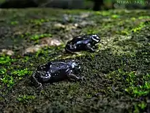 The body of Nasikabatrachus sahyadrensis appears robust and bloated and is relatively rounded compared to other more dorsoventrally flattened frogs. Their flattened body assists them to cling to submerged rocks and boulders which essentially helps them fight strong currents, allowing them to remain near stream banks where they typically reside.[6] Its arms and legs splay out in the standard anuran body form. Compared to other frogs, N. sahyadrensis has a small head and an unusual pointed snout. Adults are typically dark purplish-grey in color. Males are about a third of the length of females.[7] The specimen with which the species was originally described was 7.0 cm (2.8 inches) long from the tip of the snout to the vent. Tadpoles of the species had been described in 1917 by Nelson Annandale and C. R. Narayan Rao as having oral suckers that allowed them to live in torrential streams.[3][8] Suckers are also present in rheophilic fishes of genera such as Glyptothorax, Travancoria, Homaloptera, and Bhavania, adaptations that are the result of convergent evolution. Some of these fishes co-occur with Nasikabatrachus tadpoles in the hill streams.[7][9] Its vocalization is a drawn-out harsh call that sounds similar to a chicken clucking. Males of this species exhibit the unique behavior of calling from under a thin layer of soil. Some other burrowing frogs (Myobatrachus gouldii and Arenophyrne rotunda) are known to do this, but these frogs have also been observed to call from the surface, while N. sahyadrensis has not.[10] The frogs may switch to headfirst burrowing due to their wedge-shaped skull and other shaped limbs.[11]