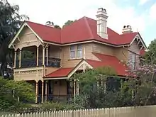 The front elevation is dominated by a double-storeyed gabled verandah on the left which has cast-iron balusters and frieze and a pierced timber valance. On the right is a gabled portico. This leads onto a small verandah, enclosed by timber louvres, which projects to the side.[1]