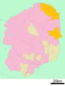 A map of discontiguous Nasu District. The town of Nasu is to the north, Nakagawa to the south.