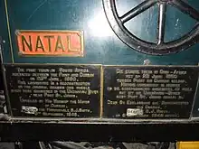 The first locomotive to run in revenue service in South Africa, the Natal Railway Company's engine Natal, was landed at Durban Harbour on 13 May 1860. It made its inaugural run on 26 June 1860, during the official opening of the first operating railway in South Africa.[1][2]