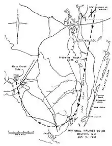 2511's flight plan called for it to fly south from New York to Wilmington, North Carolina, where it would continue south over the Atlantic Ocean. It would fly south 550 miles (890 km) over the ocean to Palm Beach, Florida.[8] The crew maintained radio contact with National Airlines' radio controllers and air traffic control, reporting clouds and instrument flying conditions.[4] The crew checked in with Wilmington Airport at 2:07 a.m.,[12] and later reported flying over the Carolina Beach radio beacon at 2:31 a.m. This was the last radio contact with the airplane.[4]