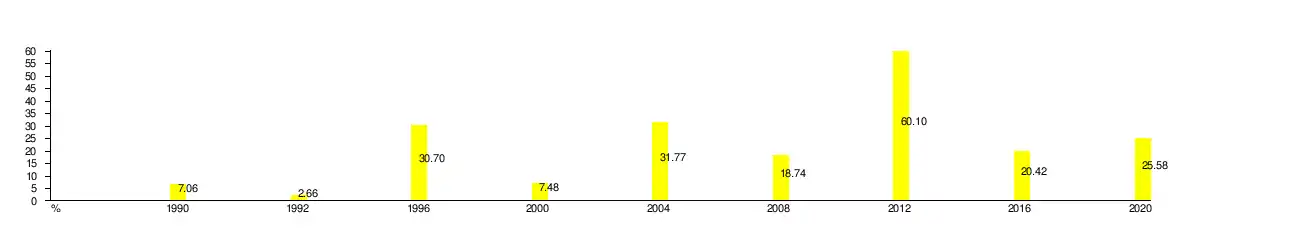 Nevertheless, after a change of leadership that saw Ionescu-Quintus as the new party leader elected in 1995, the PNL contested the 1996 general election once again as part of the CDR.[43] The 1996 general elections represented the first peaceful transition of power in post-1989 Romania, with the PNL, PNȚCD, Democratic Party (PD), and the Democratic Alliance of Hungarians in Romania (UDMR/RMDSZ) forming a grand coalition that pushed the PDSR (formerly the FSN and FDSN) in opposition for the period 1996–2000. Furthermore, the presidency was also won by the CDR's common candidate, more specifically Emil Constantinescu, who received endorsement on behalf of all of the alliance's constituent parties (including the PNL political groups therein).