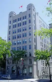 The National Press Building in Ottawa, Canada is a building on Wellington Street, just across from the West Block of the Parliament Buildings, that houses the Parliamentary Press Gallery. The building is owned by the federal government.[1] Originally the press had their offices inside the Centre Block of the Parliament buildings. By the mid-1960s these areas had become overcrowded, and the large number of journalists based in desks lined against the walls of hallways were deemed a fire hazard. Thus the press were moved to their new home across the street. The Italian Renaissance building, originally named the Norlite Building, had been constructed in 1917-1919 and originally held several government agencies.