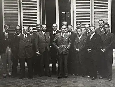 Members of the CNR after the Liberation of Paris, September 1944. From left to right: Jacques Debû-Bridel (FR), Pierre Villon (FN), Gaston Tessier (CFTC), Robert Chambeiron (deputy secretary-general), Pascal Copeau (Libération-Sud), Joseph Laniel (AD), Jacques Lecomte-Boinet (CDLR), Georges Bidault (president), André Mutter, Henri Ribière (Libération-Nord), Daniel Mayer (SFIO), Jean-Pierre Lévy (Franc-Tireur), Paul Bastid (PR), Auguste Gillot (PCF), Pierre Meunier (secretary-general) and Louis Saillant (CGT)