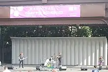 The National Sylvan Theater — often simply the Sylvan Theater — is a public sylvan theater on the grounds of the Washington Monument, National Mall, in Washington, D.C., USA. It is located within the northwest corner of the 15th Street and Independence Avenue intersection,[1][2] about 450 feet (137 m) southeast of the Washington Monument. A wooden stage is set in a graded depression surrounded by a grove of trees and appears as a sort of natural amphitheater integral to the historic greensward of the monument grounds. A gathering of 10,000 event attendees may stretch from the theater stage back to the base of the monument.[3] The Sylvan Theater was the first federally funded theater in the United States.[4]