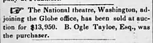 The National Theatre was founded on December 7, 1835, by William Wilson Corcoran and other prominent citizens who wanted the national capital to have a first-rate theatre.[2] The theatre's initial production was Man of the World.[2] It was purchased in 1844 by Benjamin Ogle Tayloe of the B.O. Tayloe House for $13,950.[3]