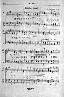 - ↑ In the interwar period, tamsumas was written as tamsumus,[24][25][33] with the rare type IV masculine noun ending. Tamsumus is occasionally still sung.[27][28][29][32][34]
