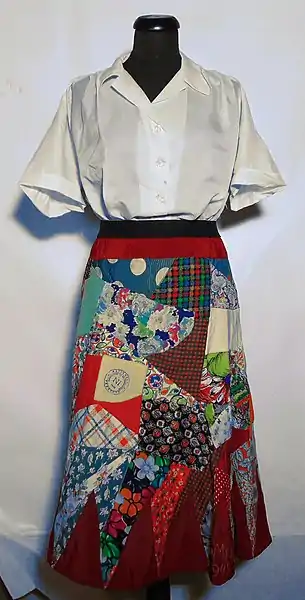 At the request of the Netherlands Information Bureau (NIB), Boissevain-van Lennep travelled to the United States in 1949, visiting 27 states and championing the "Magic Skirts of Reconstruction".[3] Her preferred nickname was "levensrok" (skirt of life) while others in the Netherlands used "bevrijdingsrok" (liberation skirt) or "oranjerok" (orange skirt, referring to the House of Orange, the reigning Dutch royal family).[1] Each had one or more triangles sewn near the front hem on which the date of the Dutch Liberation Day, 5 May 1945, was embroidered; some also had the dates of later celebrations in which the makers participated.[4][5] Prominent among the colours in these feestrok were the Dutch national colours: red, white, blue, and orange.[5] The skirts were individually registered in a national archive under the names of their makers, and their identification number was often embroidered into the skirt itself.[4]